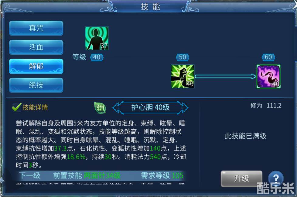 解郁类只有三个技能,门派奶点钩吻以及两面针,辅助奶点两面针护心胆。两面针作为护心前置,所以两面针都是要点的。钩吻隶属法术伤害但是不算元素伤害,抗性对于钩吻是不起作用的,这个在打门派的时候十分有用。两面针加毒攻击毒抗防刀客心魔,护心胆防各种控制,都是十分有用的技能。