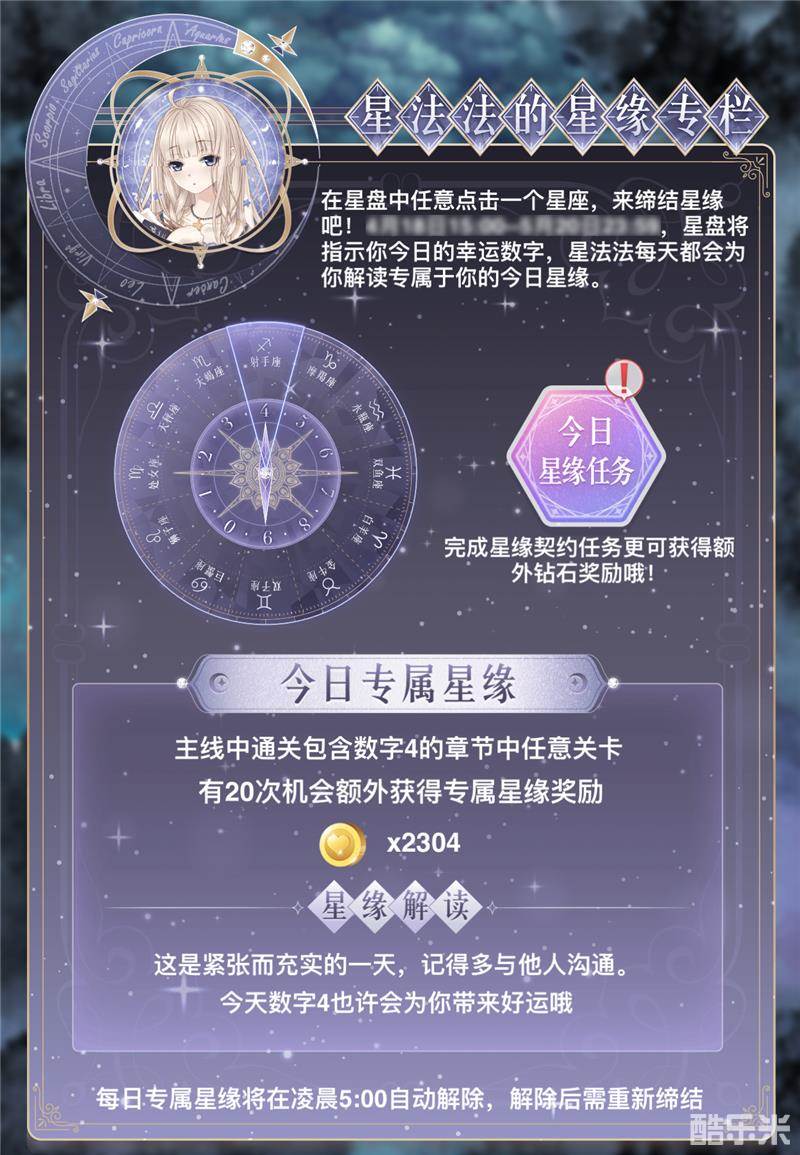 活动期间,每天点击星座缔结星缘后,除了可获得专属星缘奖励,还可领取到当日的星缘任务,完成即可解锁星缘契约,领取对应契约星级的钻石奖励!