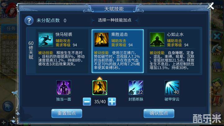 第二,60天赋,我喜欢乘胜追击。如果有能力点满肯定点满。毕竟对方被束缚了,你可以为所欲为啊,如果你被对方束缚,那就输了一半。(本人为了门派修炼主点束缚抗性和定身抗性、晕眩抗性)