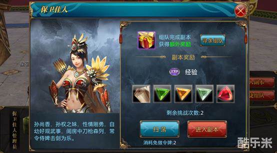 其中,我们的这个副本的任务是在我们的等级符合要求之后才是可以开启的,不过每天限制大家只能进入两次,在副本的主要任务就是来保护我们的孙尚香不被色狼骚扰,我们只要在副本中杀掉所有的色狼,我们就算大功告成了!