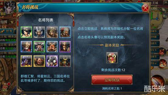 为了能够让玩家轻松挑战三国各大名将,《御龙在天手游》将三国时期的各大名将集结在一起,由玩家随机挑战,而且奖励也是非常丰富的;进入副本之后击杀主将即可完成挑战,获得相对应的奖励,每一个名将的奖励都不相同,名将颜色越高,奖励越丰富(紫>绿>黄>蓝>白);