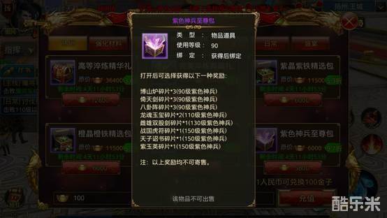 在角色达到90级之后,就会开放神兵系统。神兵一共有18种,神兵的品质共分为三种颜色:黄色、绿色、紫色,其中黄色有三种,绿色有七种,紫色有八种。神兵的合成需要神兵碎片,黄色需要20个,绿色需要30个,紫色需要40个。总体来说,神兵分为两大类,攻击类和防御类,攻击类有8种,防御类有10种