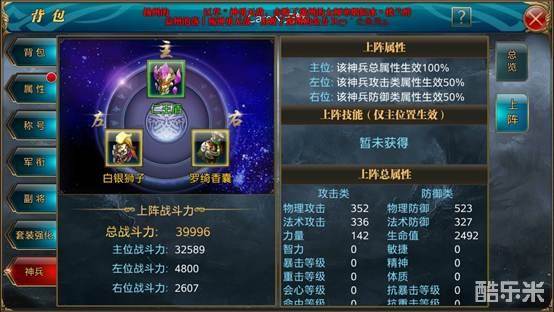 神兵阵法分为三类:主位、左位、右位。玩家们可以根据不同神兵安排合适的上阵方位,每个神兵放置位置的不同所加的战力也各不相同。主位神兵的所有属性100%生效,左位神兵的攻击属性50%生效,右位神兵的防御属性50%生效。所以说,玩家们在安排神兵出阵的时候,一定要看好神兵的类型,主位安排各属性最高的一个出阵,攻击神兵放左位,防御神兵放右位。