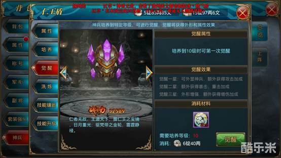 培养到十级的神兵可以觉醒,觉醒后神兵可以外显,都有额外的战力加成。外显之后,就会有一个很炫酷的神兵围绕再角色周围。觉醒的时候需要千钧玉,千钧玉可以在商城或者寄购买,对于普通玩家来说,这是一笔不小的开销。