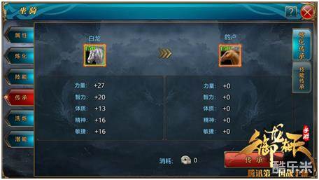 4.坐骑更换完成后,原有坐骑上的【炼化属性】和【坐骑技能】都需要通过【坐骑】-【传承】继承到新的坐骑上;