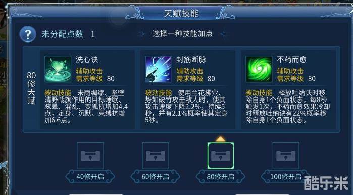 使敌人攻击速度下降并有概率使其定身,推荐自己主攻击或者单人任务使用(搭配技能兰花拂穴、势如破竹和40修天赋准心诀、60修天赋乘胜追击使用)。