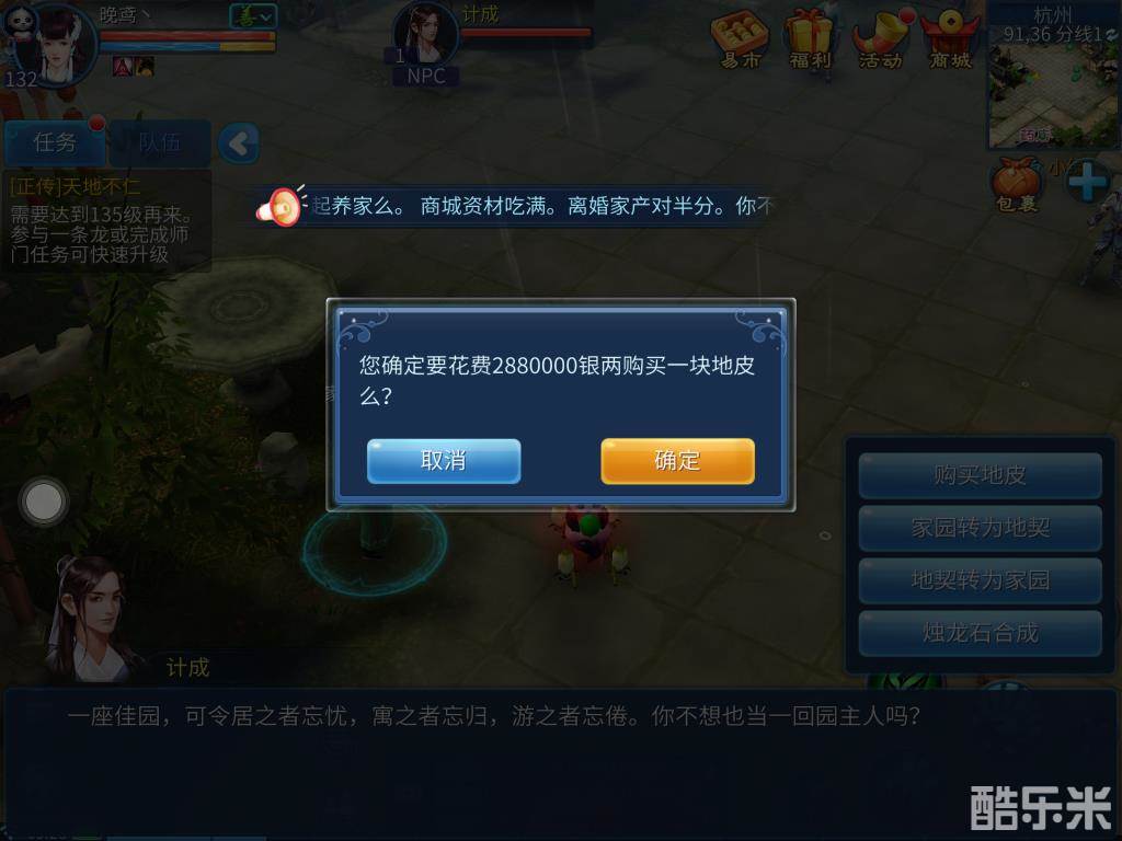 在杭州91.36计成处花288W两银子可以购买一块地皮,于是你就有了一座一级家园。已经有家园的小伙伴不能重复购买了哦。当然,如果你把家园转了地契,那是还可以购买的。
