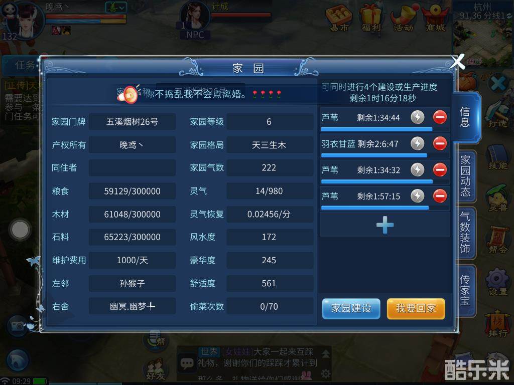点开+号就可以看见家园图标,点开就可以看到你的家园的详细信息。等级,格局,气数,灵气。家园气数影响灵气恢复以及祈福属性条。家园等级影响祈福基础属性,灵气上限以及每天可偷菜次数。