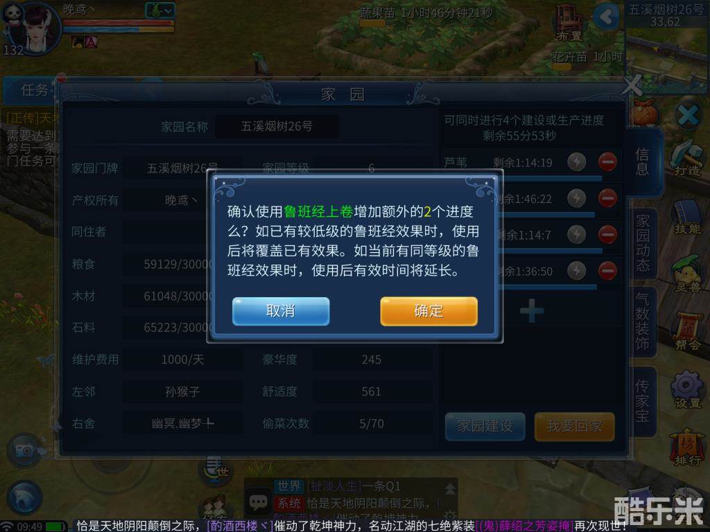 家园建设生产进度默认是两个,使用鲁班经可以增加进度,一个的效果是24小时。有上中下三卷,低级效果会被高级覆盖,同级继续吃可以延长有效时间。