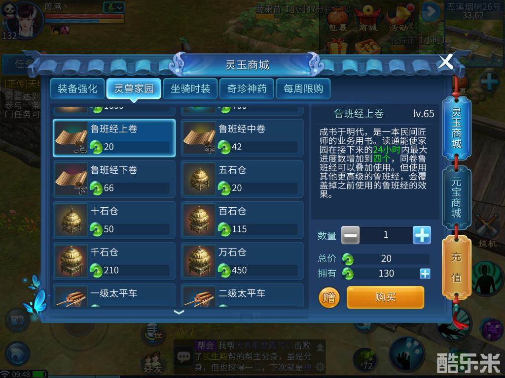 鲁班经可以在灵玉商城购买,上卷+2进度,中卷+3进度,下卷+4进度。每周限购的家园福利包,也会随机开出。我的建议是前期使用上卷开4个进度足够了使用了。还有石仓,是增加家园资材的,可以考虑自己的要求适量购买。