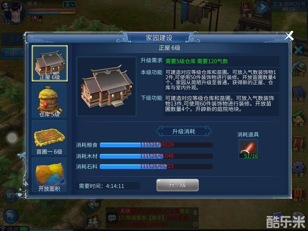 关于家园升级呢,会告诉你需要多久,前提条件是几级的仓库,多少的气数,消耗多少资材,要多少个琉璃瓦,其中消耗的粮食、木材、石料就需要我们种植农作物获得。比如从上图可以看到正屋升级1级需要10点气数,而气数是需要装备有气数的家具才可以获得,当都满足就可以点升级啦,当然你要预留一个进度条用于家园升级。琉璃瓦不够是直接消耗银两的哦。关于苗圃仓库的升级同理。