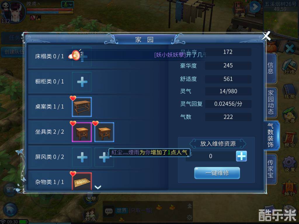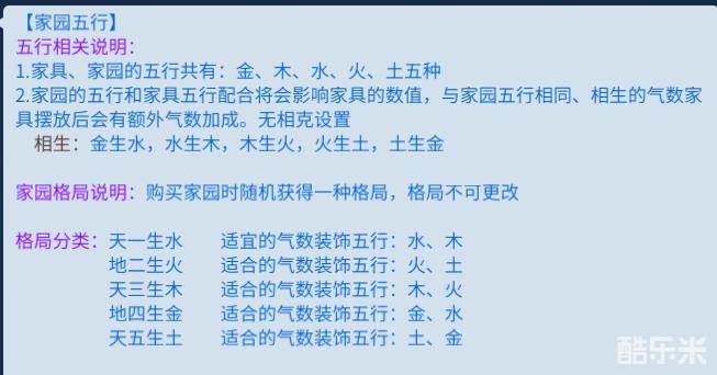 家园升级需要的气数,主要看家具+的数值。家具有金木水火土五个属性。家园的格局不一,适合的家具也不一样。放置合适属性的家具会有额外的加成。关于家园的格局使用的家具属性,可以去询问小精灵哦。