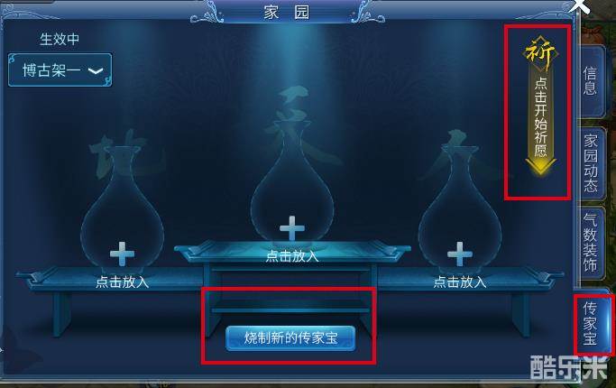 点击祈愿,祈愿是玩家将家园气数与摆放的传家宝属性生成为自身buff加成的途径。祈愿后,获得的buff可持续24小时。