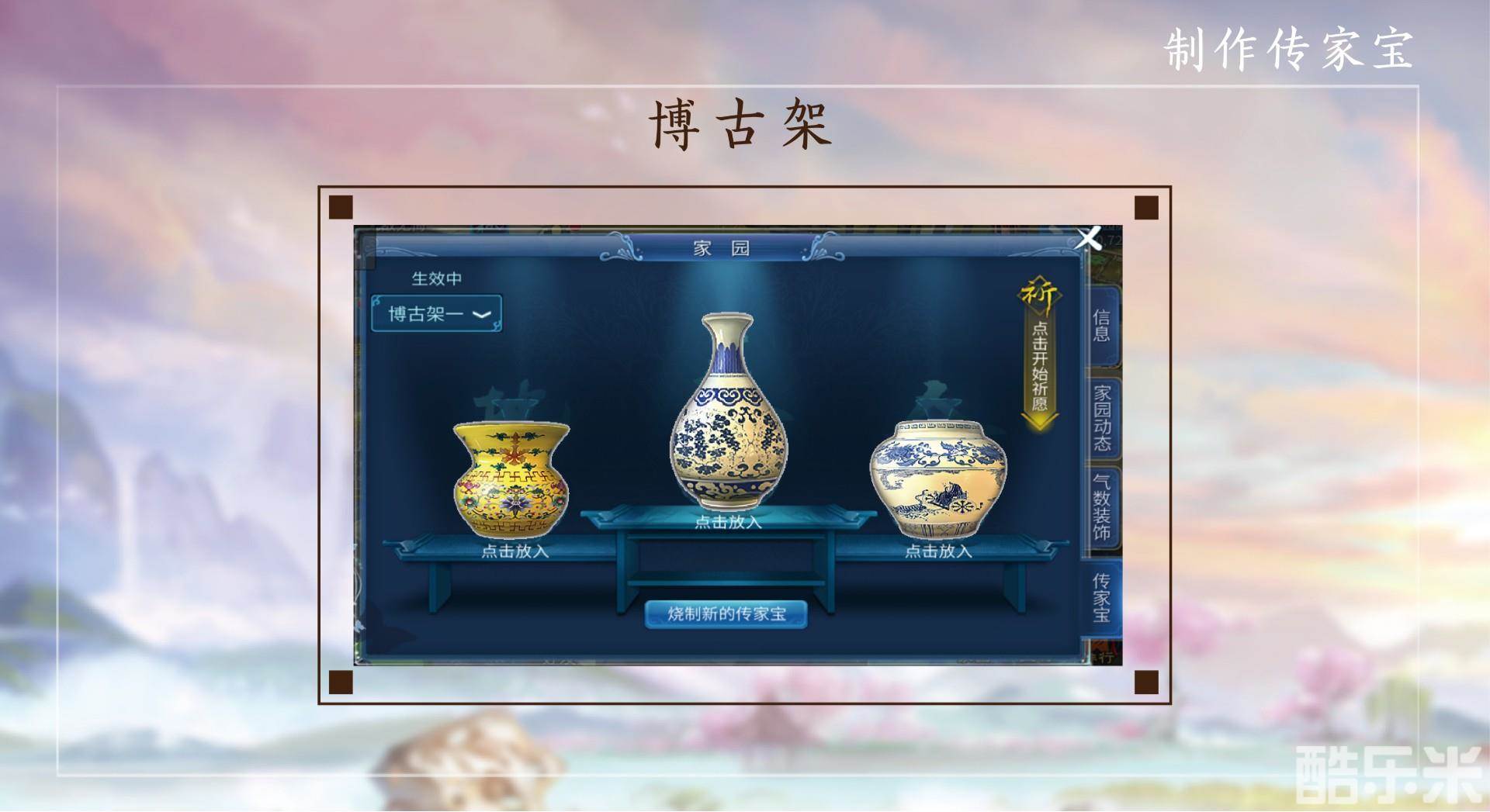 制作成功后就可以将传家宝放置博古架中,左边是地格,中间是天格,右边是人格。