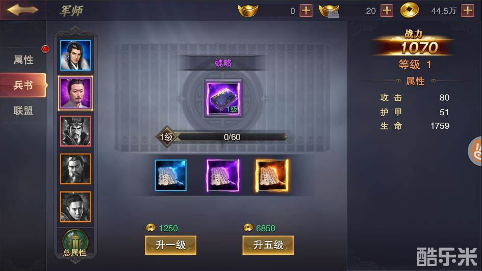 类似于装备的镶嵌功能,兵书分为三种品阶,由低至高分别位:普通、稀有、史诗;兵书只能装填在与其品质相对应的军师上。激活后的兵书可以通过消耗各种品质的兵书残卷进行升级,升级后的属性将大量提升,兵书的等级不能超过对应的军师等级。