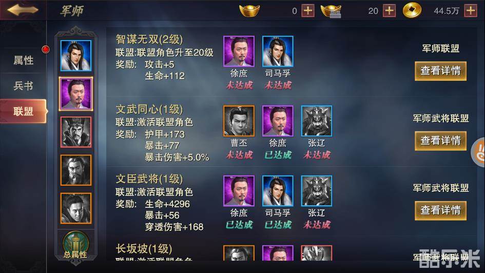 联盟则体现了我们与军师的联盟情况和属性,同时军师、武将之间有联盟关系。我们一旦收集了对应的军师即可激活联盟,激活联盟后将获得联盟奖励。联盟效果可以通过对应军师的培养升级,需要满足一定的条件后方可升级升级后的联盟效果可以提升更多战斗力,