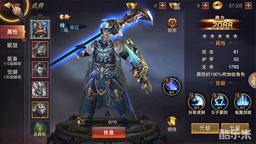 武将系统的属性、装备系统与联盟系统可以与军师一一对应,保持着武将与加成的关系。“觉醒”是武将系统的一个亮点。变身为武将的同时,我们的角色外观焕然一新,武将系统中的觉醒技能不仅能够大幅提高攻击等各方面的数值,而且增添了流光效果(同样应用于我们的外形),觉醒共分五阶,每阶需要进行6次提升。