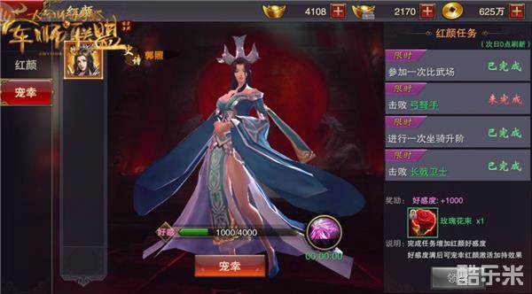 宠幸是红颜内的任务系统, 系统内的每个任务均需要在30分钟内完成,如中途放弃或超时,则无法重复接取失败任务。我们每天最多就完成4个任务,这样做的目的自然是为了刷好感度。完成任务我们可以获得玫瑰花束和1000点好感度,好感度满后可以激活30分钟红颜的加持效果。