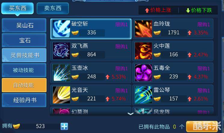 而自动类被动类灵兽技能则是需要通过元宝购买技能书进行升级,等级越高,需要对应技能书的数量也越多。
