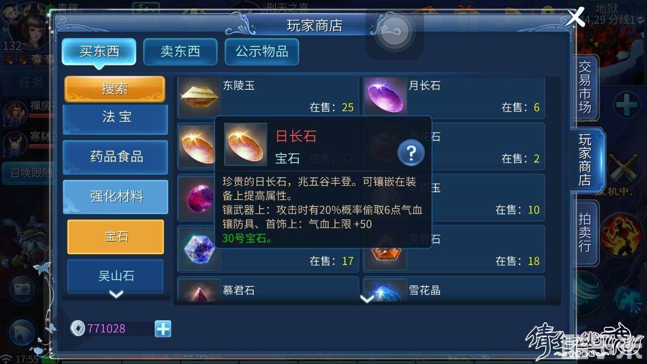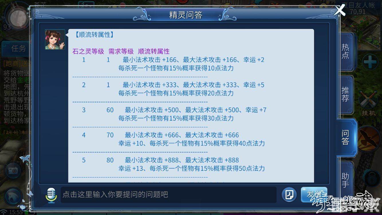 顺流转(4孔)琥珀+透辉石+猫眼石+东陵玉(增加最大最小法术攻击,幸运,每杀一个怪物有概率恢复部分法力)