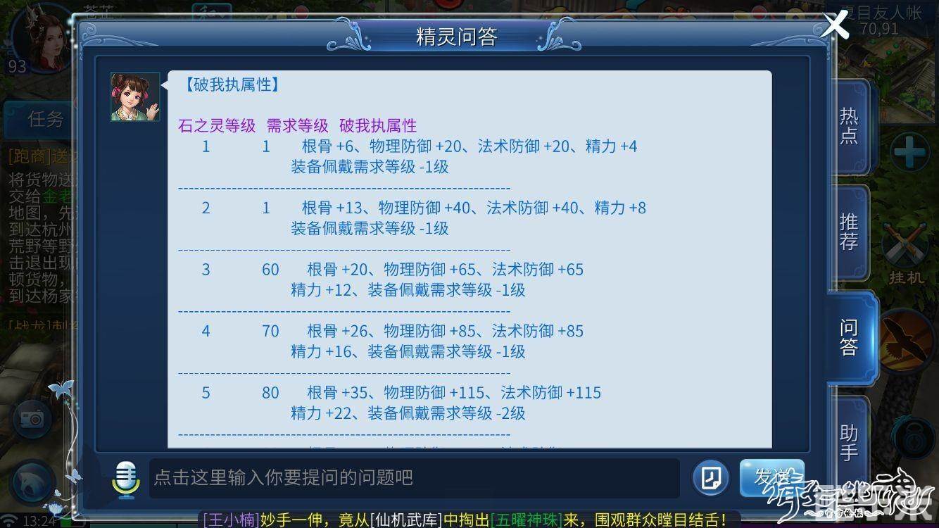 破我执(5孔)珍珠+石榴石+幻色石+孔雀石(增加根骨、物理防御、法术防御、精力、佩戴等级降低)