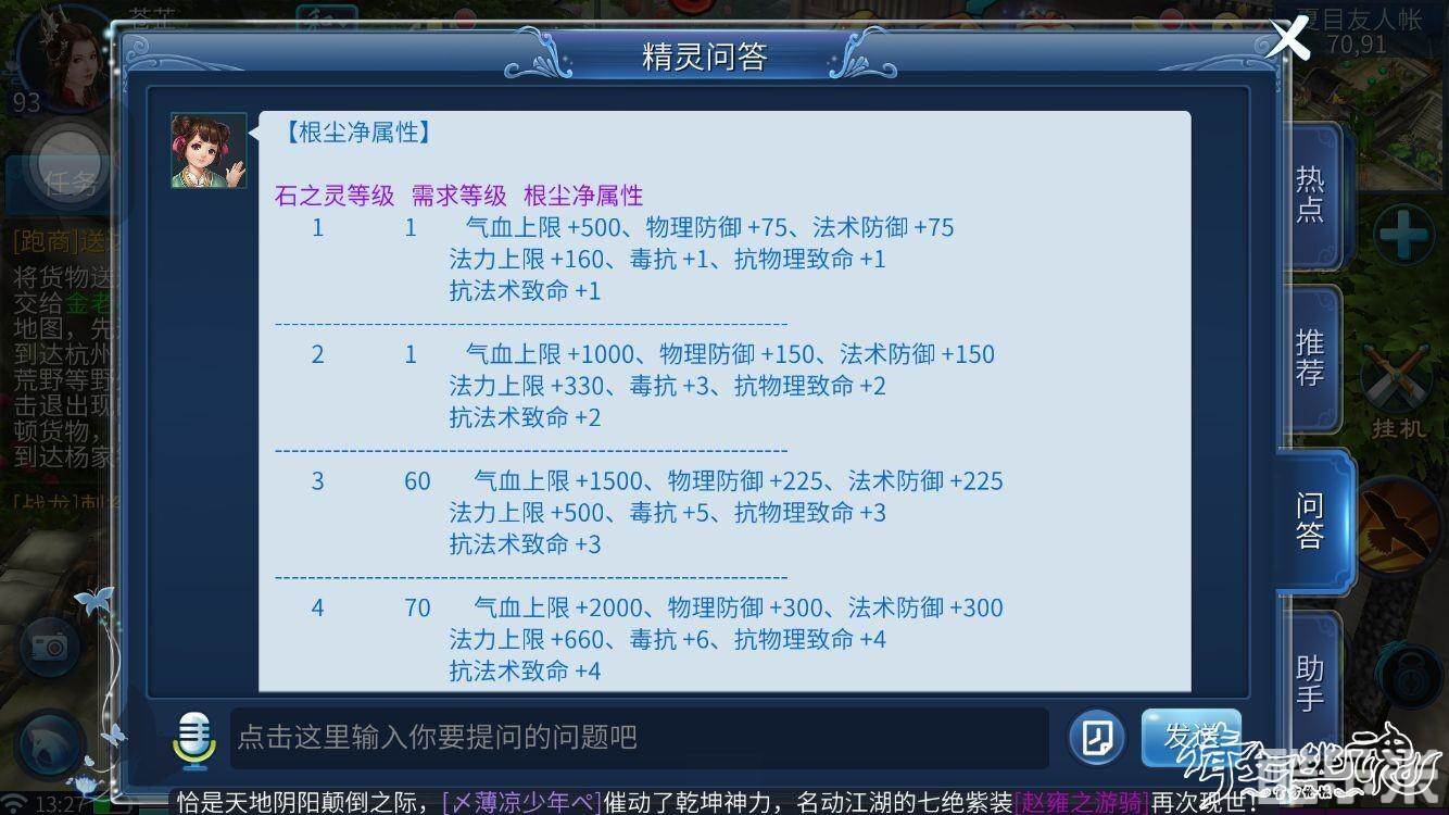 根尘净(6孔)珍珠+夜明珠+透辉石+猫眼石+丹泉石+偶泊石(增加气血上限,物理防御,法术防御,法力上限,毒抗,抗物理致命和法术致命)