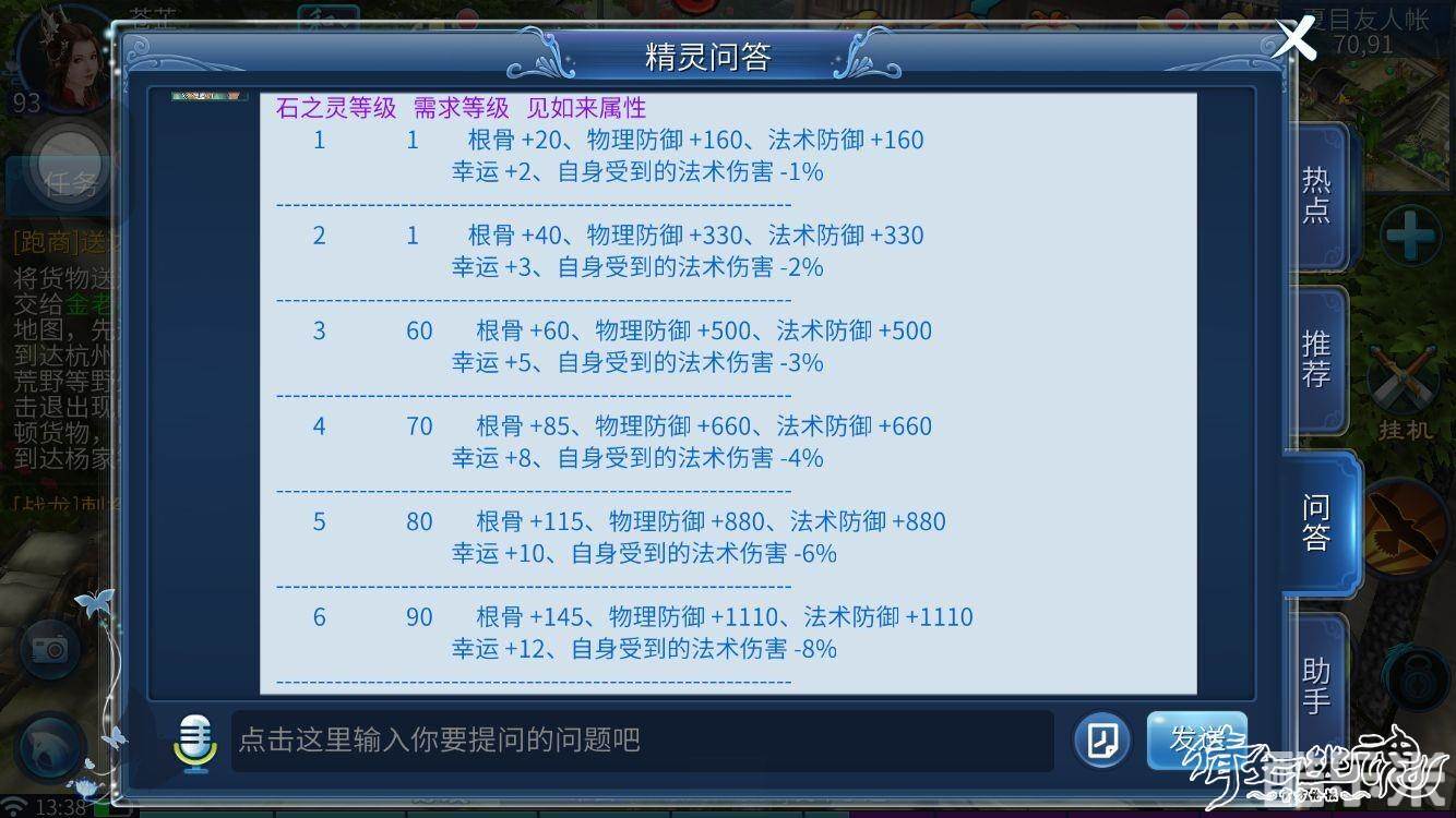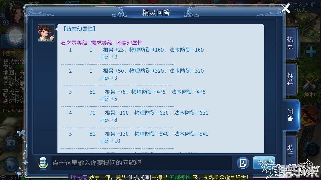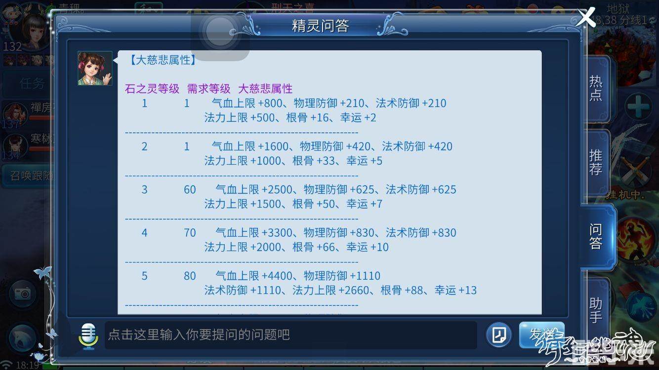 大慈悲(5孔)石榴石+东陵玉+芙蓉石+慕君石+昆吾石(增加气血上限,物理防御,法术防御,法力上限,根骨,幸运)8级大慈悲或以上还有技能等级加成