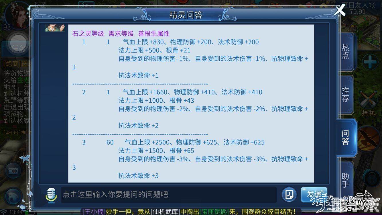 善根生(6孔)石榴石+东陵玉+芙蓉石+慕君石+雪花晶+昆吾石(增加气血上限,物理法术防御,法力上限,根骨,受到的物理和法术伤害降低,抗物理和法术致命增加)8级善根生或以上有技能等级加成