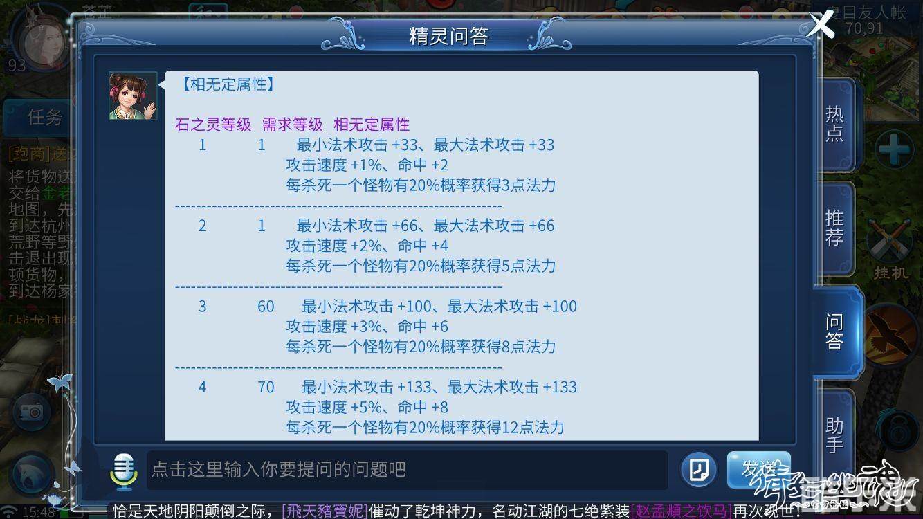 相无定(5孔)琥珀+夜明珠+瑾青石+透辉石+石榴石(增加最大最小法攻,攻速,命中,每杀一个怪物有概率恢复部分法力)