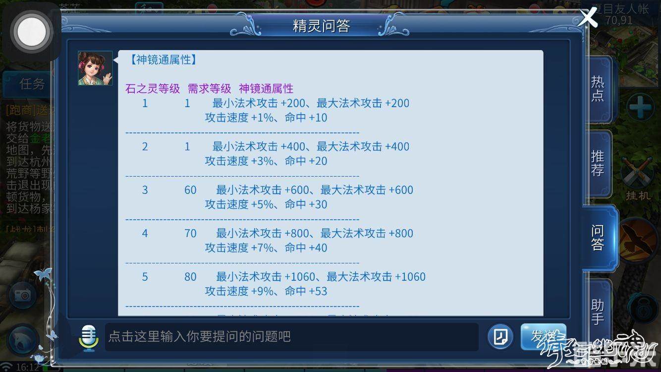 神镜通(5孔)琥珀+虎眼石+偶泊石+青金石+羊脂玉(增加最大最小法攻,攻速,命中)8级或以上神镜通有技能等级加成。适合异人单手杖