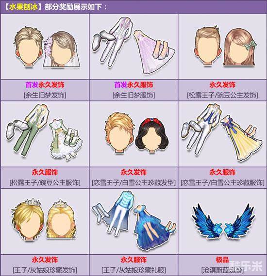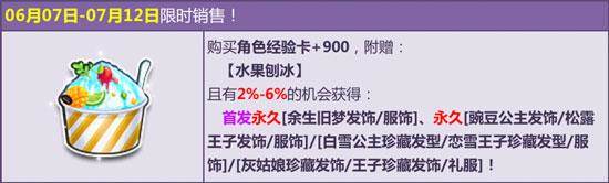6月7日-7月12日,购买角色经验卡+300,附赠【水果刨冰】,有机会得首发永久发饰【余生旧梦发饰/服饰】、永久【豌豆公主发饰/松露王子发饰/服饰】/【白雪公主珍藏发型/恋雪王子珍藏发型/服饰】/【灰姑娘珍藏发饰/王子珍藏发饰/礼服】或其他奖励之一!其中核心极品期限型概率范围为:4%-6%,核心奖励永久型概率范围为:2%-4%,非核心奖励概率范围为:90%-94%。