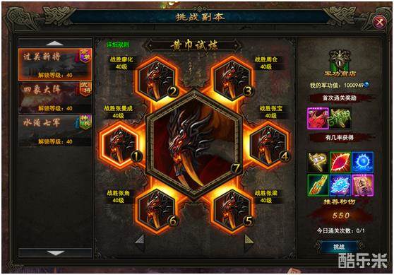 上图为主界面右上角挑战图标按钮,当玩家点击此按钮后,弹出以下挑战副本界面,玩家可在挑战副本界面界面中进行选择不同类型的挑战副本进行挑战,如下图1-1不同的挑战副本,挑战限制条件不同。玩家可在选择的挑战副本界面中预览首次通关奖励和副本通关掉落奖励,以及秒伤推荐。下图为过关斩将挑战副本,挑战副本可获得军功值。军功值可兑换装备如下图1-2