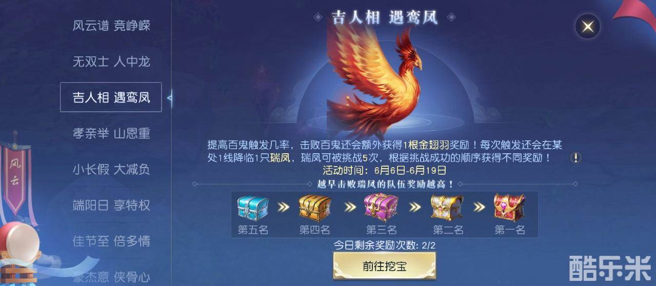 “无双士 人中龙”活动里,天命者们只要上交风云会所需的材料就能收获丰厚奖励,其中“名士佩”还有谜题待解,只要解谜成功就能收获额外奖励!活动期间进行百鬼猎行,即可参与“吉人相 遇鸾凤”、引瑞凤降临!除了击败百鬼的额外“金翅羽”奖励,成功挑战瑞凤的队伍还有额外奖励送上——名额有限,先到先得!