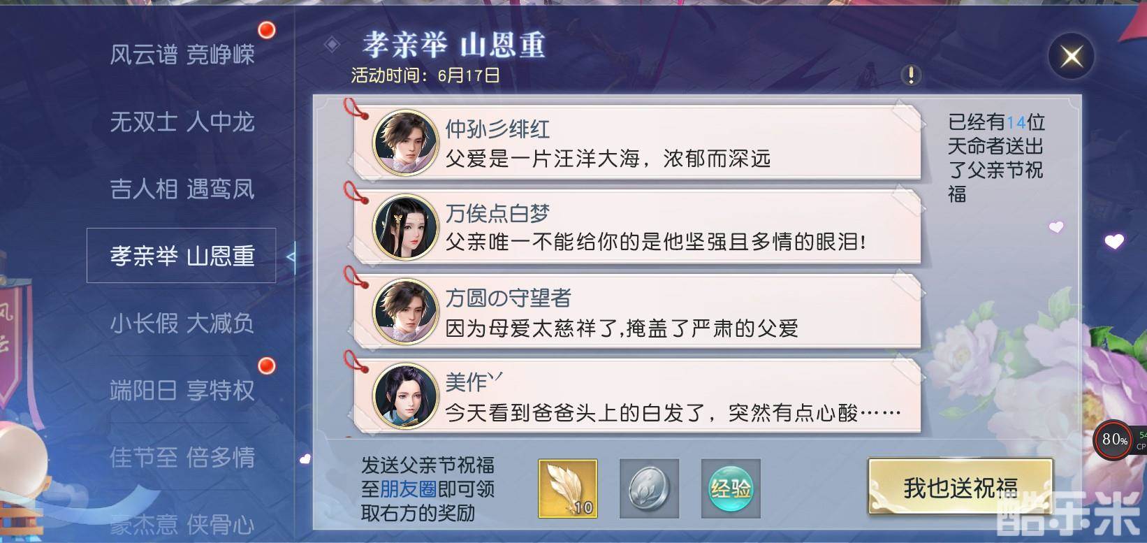 6月17日当天,父亲节活动“孝亲举 山恩重”也将上线,只要在活动界面送出对父亲的祝福,并分享到朋友圈,即可收获金翅羽、经验、银币等奖励!