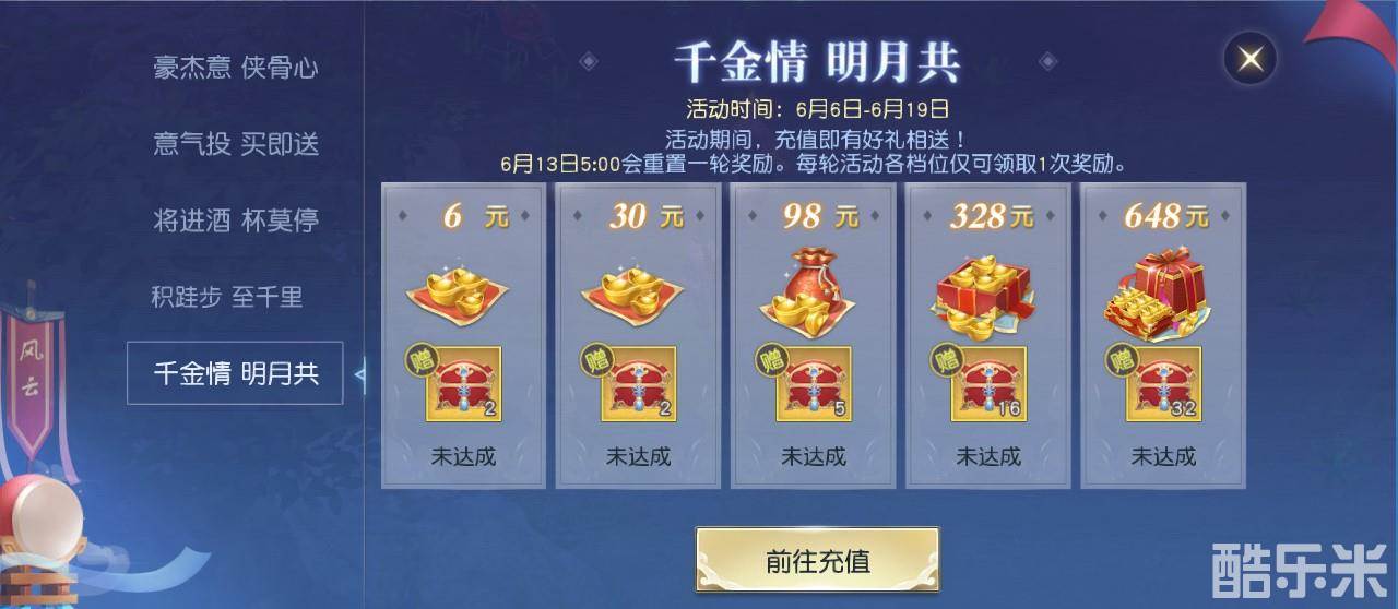 “千金情 明月共”活动也将同步进行,不同档位奖励各异,6月13日还会重置活动、让天命者们领到更多福利!
