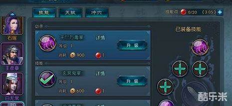 在游戏中,技能的等级提升需要消耗铜币以及技能点,技能点满值为20点,消耗后可跟随时间流逝而恢复。并且,技能的等级受到角色等级的限制(如:角色等级为x级,则技能等级只能升到x级)。