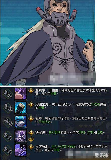 半藏的被动与双追打都是比较有亮点的技能,半藏的追打控制有两层异常状态在对付一些驱散一个不良状态的医疗忍者时即使没了控制效果,被控忍者还是受到额外的点燃伤害,奥义、毒雾喷射配合队伍追打连击或自身普攻可以造成中等伤害是一个不错的平民忍者,就连土豪平时也会带出来遛遛!