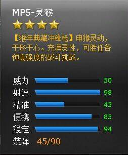 武器描述:在MP5枪型基础上进行全面升级的灵猴系列主武器。具有十分优秀的枪支属性,适合多种模式。以灵猴为设计主题的塗装以金、蓝为主色调兼具神秘、时尚和优雅,是一款十分值得珍藏的猴年主题武器。