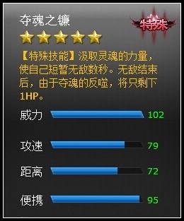 武器描述:冷艳、嗜血、神秘又充满死神致命诱惑的近战武器——夺魂之镰,是火线精英又一款拥有特殊技能的星级武器。只有能够驾驭它的人才能成为真正的夺魂之神。