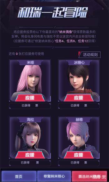 疯丫头冰糖心、可爱米娅、成熟魅力赫雅、超能少女海拉,谁将和瑞一起冒险?通过”修复纳米核心“任务就可获得投票券,快把应援票投给你最喜爱的“纳米偶像’吧!