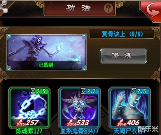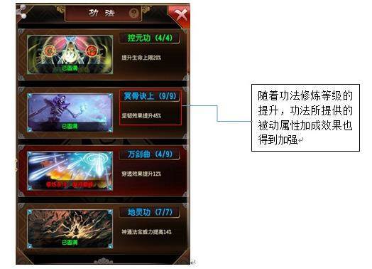 功法即为玩家在游戏内可获得的技能秘籍,每一本功法内包含了若干的技能(即为神通)。玩家需要通过修炼功法(点击修炼即可),提升功法的等级,从而解锁功法内所包含的新的神通技能。