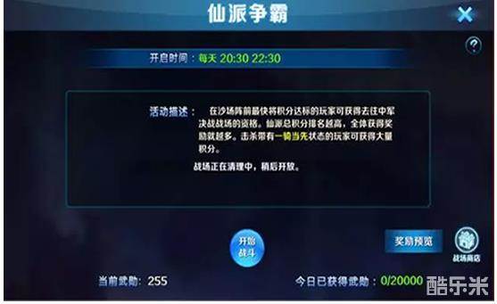 仙派战场,进入后自动切换仙派模式。单个房间最多可进入三个不同仙派成员,每个仙派最多进入10个。游戏共有沙场阵前和中军决战两个阶段,进入沙场阵前战场后击杀boss和其他仙派玩家获得积分,积分达到1000可晋级中军决战战场,具体玩法留给各位仙友们自己探索吧,值得注意的是,除仙派积分总奖励外还有个人积分奖励,越单纯越容易与更好的奖励失之交臂。
