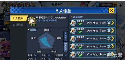 战绩信息面板也被单独划分了一个标签页。在这里玩家不仅可以看到近期五场比赛的详细信息,还能够查看自己的能力属性图。在首次测试中,玩家提出需要获得一个能够直观看到一个玩家实力的系统,而这个能力属性图便能够很好的让玩家意识到自己适合打什么,以及什么地方需要进行努力锻炼。