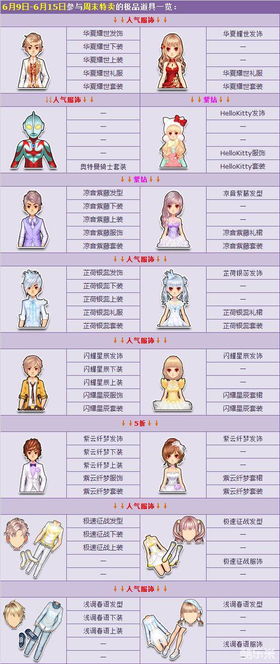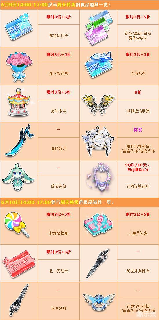 6月9日-6月15日期间,周末特卖惊喜开启,一系列极品道具折扣特卖,还有9套人气服饰5折起卖,千万不要错过哦!