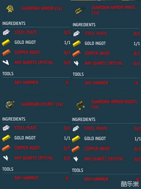 衣服:5个钢板、1个金锭、1个铜锭、5个任意水晶;