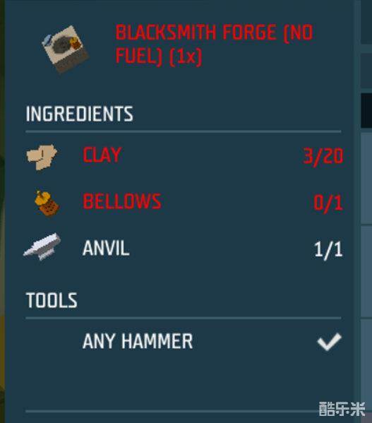 所需要原材料:20个粘土,1个风箱,1个铁砧;