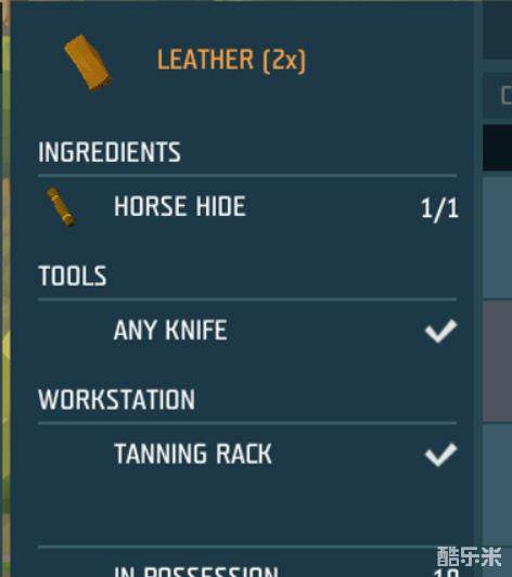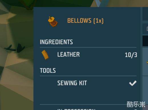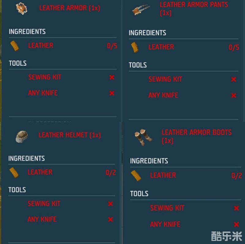 皮革通过击杀野兽获取兽皮,再经过制革架制作;针线包通过线和针制作。
