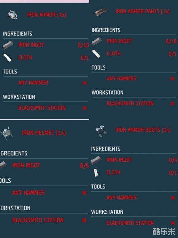 铁甲套,防御力25点,前期进入铁器时代即可制作,作为居家旅行的必备铠甲套装,具体制作配方及外观如下图: