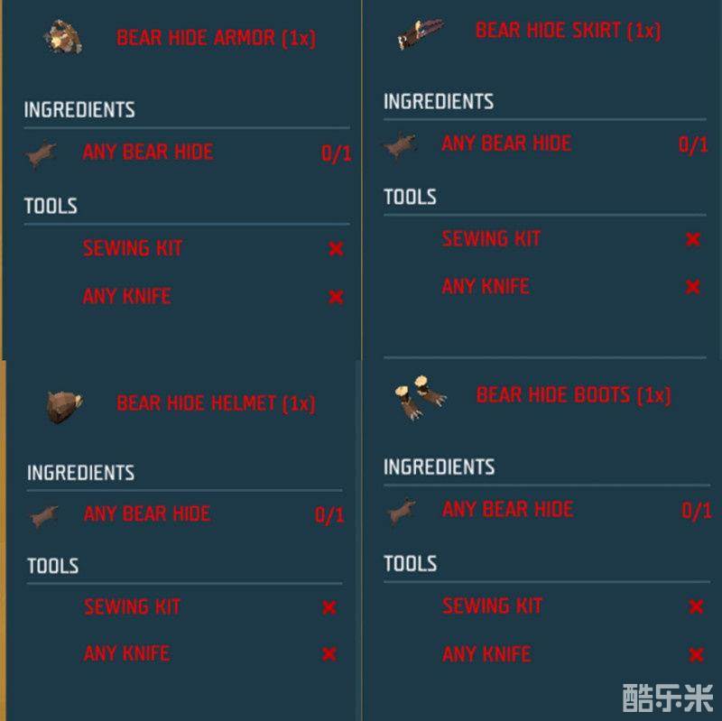 熊皮通过击杀熊获得,棕熊、黑熊以及北极熊才有熊皮掉落,变异的熊没有熊皮掉落。其余材料详见上文。