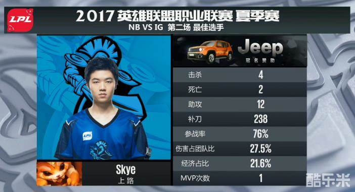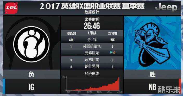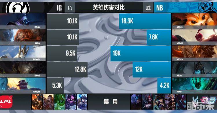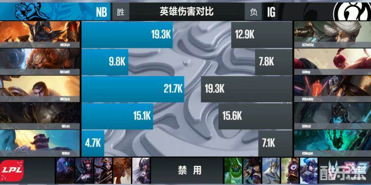本局IG选择更换上单,并拿出了一套上下双核阵容,而NB则是使用了一套中前期的节奏阵容。在比赛前期,NB从上路打开局面,盲僧帮助纳尔快速的推塔建立优势,并成功将优势滚到其他路,前期NB取得非常巨大的领先。比赛进入中期,由于单线压力过大,IG强行与NB开团,但是并无法正面与之交锋,几波交战后,NB更进一步的扩大优势并成功拿下了IG的下路高地。被逼无奈IG选择强行rush大龙,但被盲僧强下,并被NB包在大龙坑打出团灭,顺势NB一波结束了比赛,拿下今日比赛的胜利,恭喜NB!